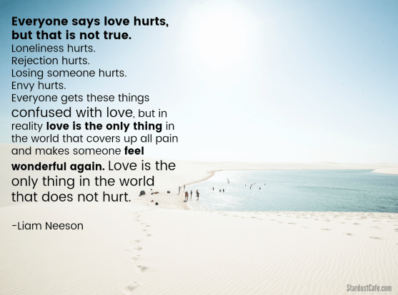 Everyone says love hurts, but that is not true. Loneliness hurts. Rejection hurts. Losing someone hurts. Envy hurts. Everyone gets these things confused with love, but in reality love is the only thing in the world that covers up all pain and makes someone feel wonderful again. Love is the only thing in the world that does not hurt. ~Liam Neeson.