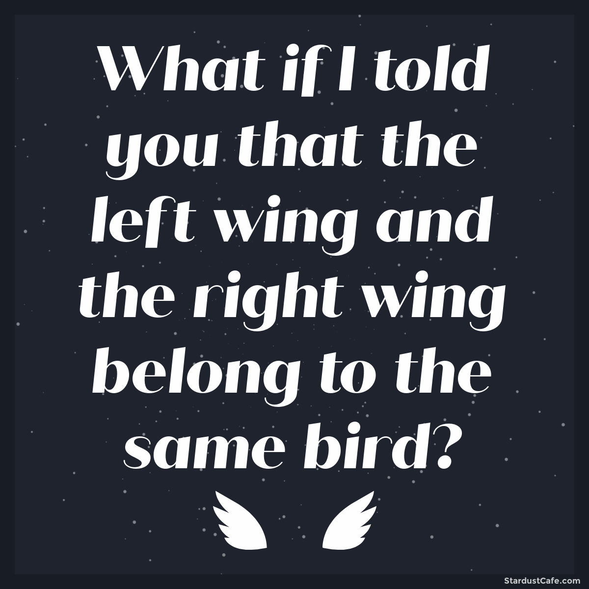 What if I told you Posted on December 9, 2020 by Louise White What if I told you that the left wing and the right wing belong to the same bird? Share this: Click to share on X (Opens in new window) X Click to share on Facebook (Opens in new window) Facebook Like Loading...