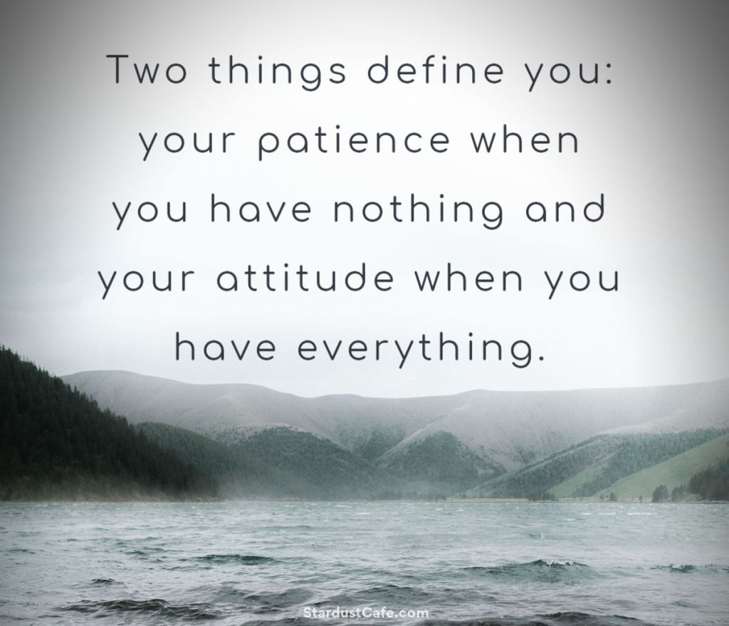 Two things that define you: Posted on February 18, 2021 by Louise White Two things define you: your patience when you have nothing and your attitude when you have everything. Share this: Click to share on X (Opens in new window) X Click to share on Facebook (Opens in new window) Facebook Like Loading...