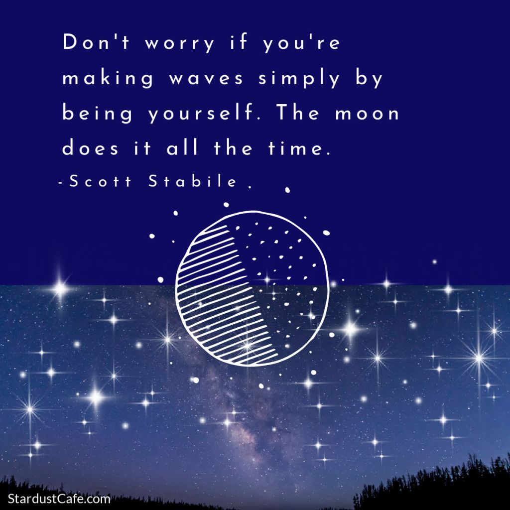 Don’t worry if you’re making waves Posted on September 30, 2021 by Louise White Don’t worry if you’re making waves simply by being yourself. The moon does it all the time.-Scott Stabile